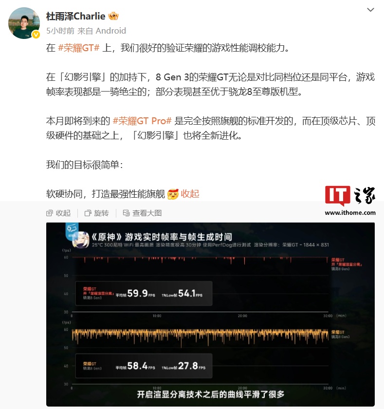 IT之家 4 月 10 日消息,荣耀 GT 系列产品经理 @杜雨泽Charlie 今日发文透露了荣耀 GT Pro 手机动向,新机确定本月发布。据他介绍,荣耀 GT Pro 手机是完全按照旗舰的标准开发的,而在顶级芯片、顶级硬件的基础之上,「幻影引擎」也将全新进化。