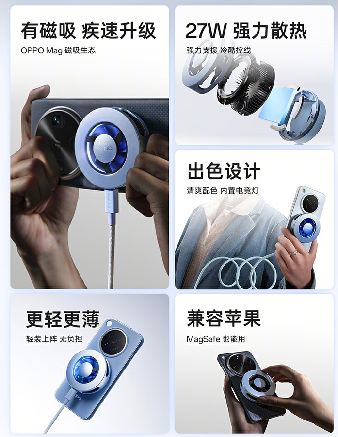 IT之家从官方介绍获悉,新品支持 27W 高功率强效散热,TEC 强力制冷,全链路制冷导热结构设计。除直接使用磁吸外,还通过夹子,可实现夹持使用;通过引磁片,可粘贴平板等更多设备进行散热。