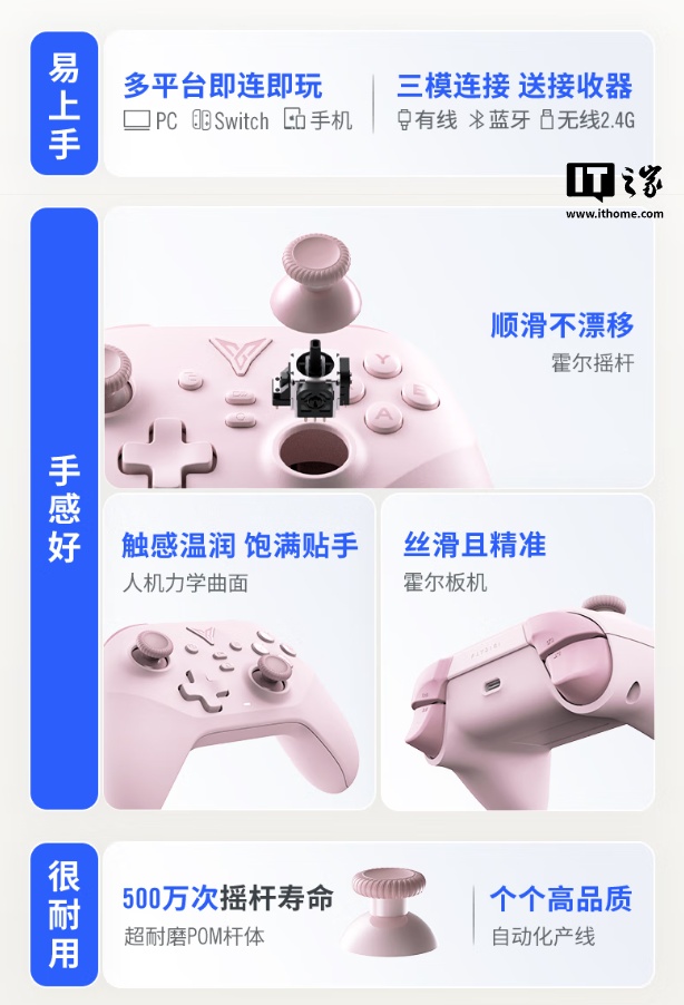 IT之家 4 月 10 日消息,飞智沙漠狐手柄「暮光粉」现已开售,新品手柄配备霍尔摇杆和霍尔扳机,、适配 PC/ Switch / 手机设备,首发 89.9 元。