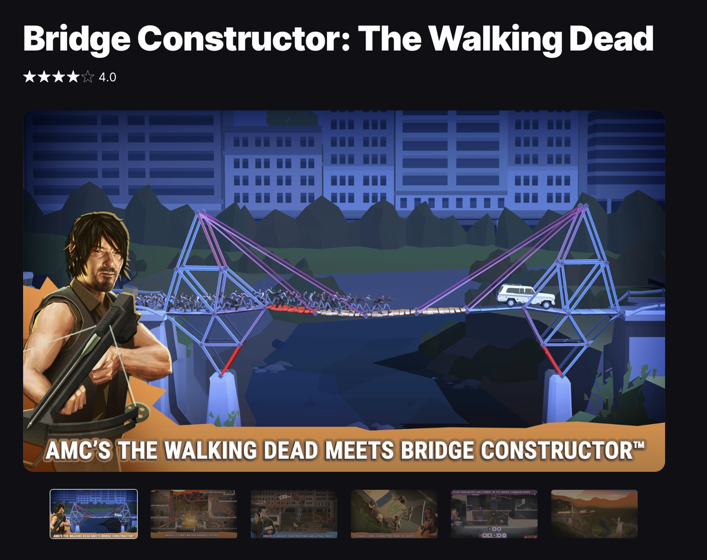 本作系《桥梁建造师》与《行尸走肉》IP 联动的策略游戏,玩家将创造桥梁指引 Daryl Dixon、Michonne Grimes 等幸存者免受僵尸最坏伤害,同时可以设计一系列陷阱引导僵尸中招。