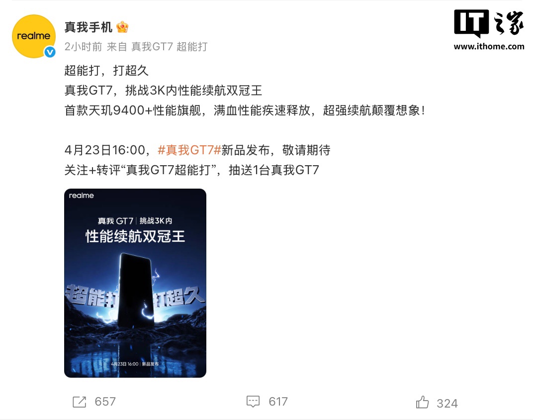 其中,realme 真我 GT7 手机将于 4 月 23 日发布,号称是“3K 价位内性能续航双冠王”,此前消息称该机配备 144Hz BOE 定制窄边护眼直屏,选用塑胶中框,厚度<8.3mm、重量<205g,手机内置“7X00mAh 电池”(容量超 7000mAh),同时配备超声波指纹、支持 IP69 防水、预装魔改版 ColorOS 系统(realme UI)。