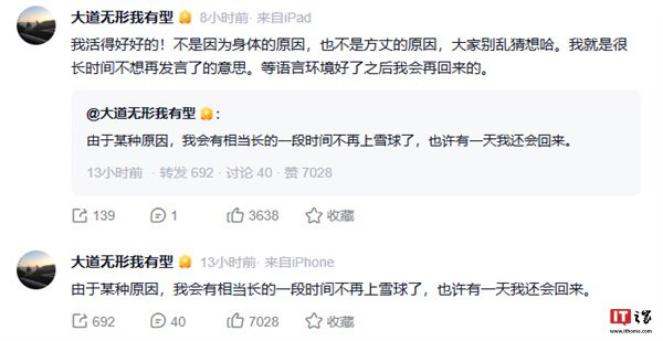 IT之家 4 月 11 日消息,投资人段永平(ID 为“大道无形我有型”)发文宣布“暂时离开雪球(投资平台)”,他声称“由于某种原因,我会有相当长的一段时间不再上雪球了,也许有一天我还会回来”。