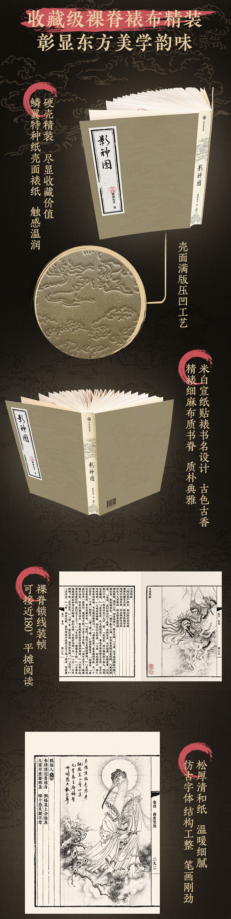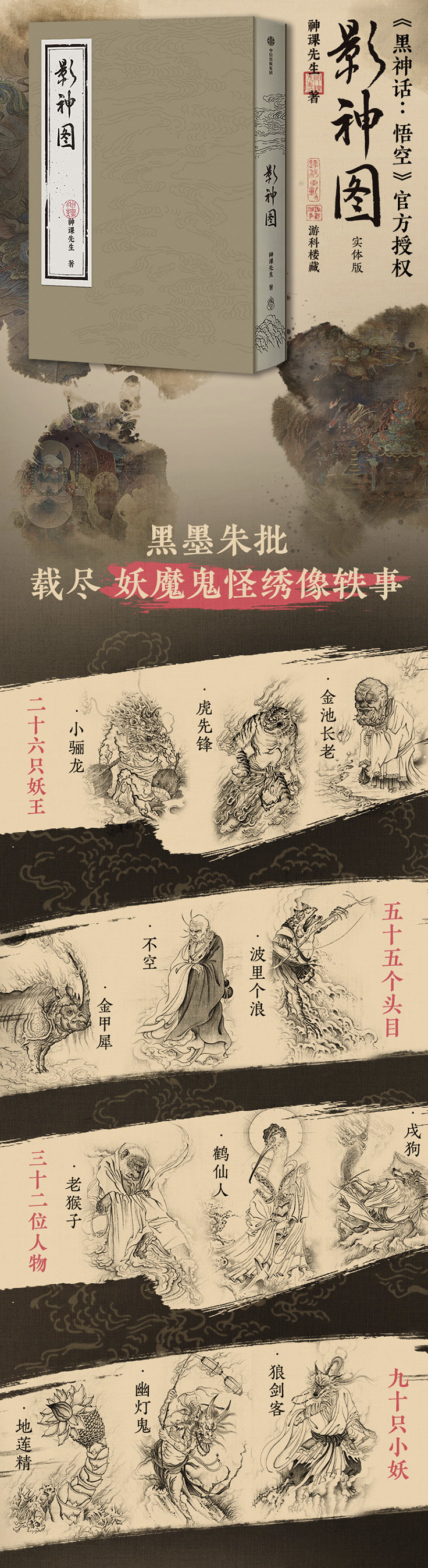 本书为游戏《黑神话:悟空》衍生画集,该画集完整复刻了游戏中的重要的道具一一《影神图》。本书将游戏主角 —— 天命人沿途所遇的精怪人物,通过细腻灵动的笔画,用传统国画技法刻画人物,绣像旁不仅附有角色姓名及短诗,连同人物背景故事也收录其中。