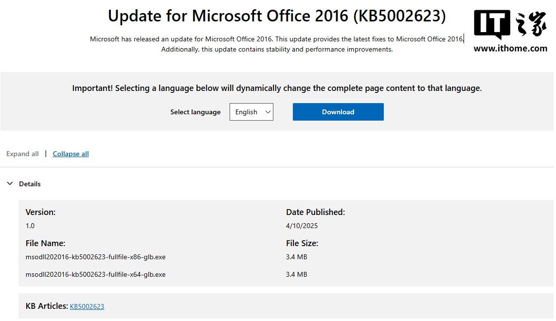 IT之家 4 月 11 日消息,当地时间 4 月 10 日,微软为 Office 2016 用户发布 KB 5002623 更新补丁,修复了 KB 5002700 中导致 Word、Excel 和 Outlook 停止响应的问题。