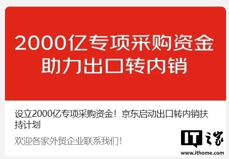 IT之家 4 月 11 日消息,京东今日宣布将推出 2000 亿出口转内销扶持计划。未来一年内,京东将大规模采购不低于 2000 亿出口转内销商品,帮助外贸企业快速开拓国内市场。