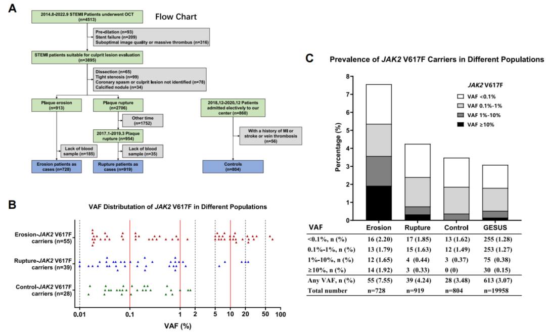 研究团队从哈医大二院心内科收治的接受光学相干断层显像(OCT)检查的 ST 段抬高型心肌梗死(STEMI)患者中,筛选出 728 名斑块侵蚀患者和 919 名斑块破裂患者,同时纳入 804 名无血栓病史的心内科择期入院患者作为对照组。通过数字 PCR 方法检测全血中的 JAK2 V617F 突变,结果显示,3.57% 的斑块侵蚀患者、0.76% 的斑块破裂患者以及 0.37% 的对照组携带变异等位基因分数(VAF)≥1% 的 JAK2 V617F 突变。与非携带者相比,突变携带者的血小板计数更高,而血脂水平和糖化血红蛋白 A1c 水平较低。