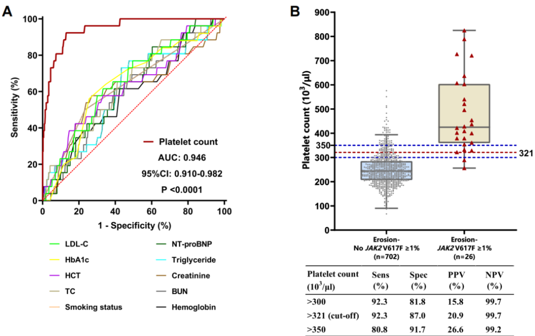 为了从斑块侵蚀患者中预测 JAK2 V617F(VAF≥1%)携带者,研究人员以携带者和非携带者中有统计学差异的基线特征为潜在预测因子,采用接受者操作特征曲线(ROC)分析这些因子的鉴别能力。结果显示,血小板计数的预测效果最佳,其临界值(cut-off 值)为 321×10³/μL。当斑块侵蚀患者的基线血小板计数低于该临界值时,几乎不会携带 VAF≥1% 的突变;而高于该临界值时,约 20% 的患者会携带该突变。