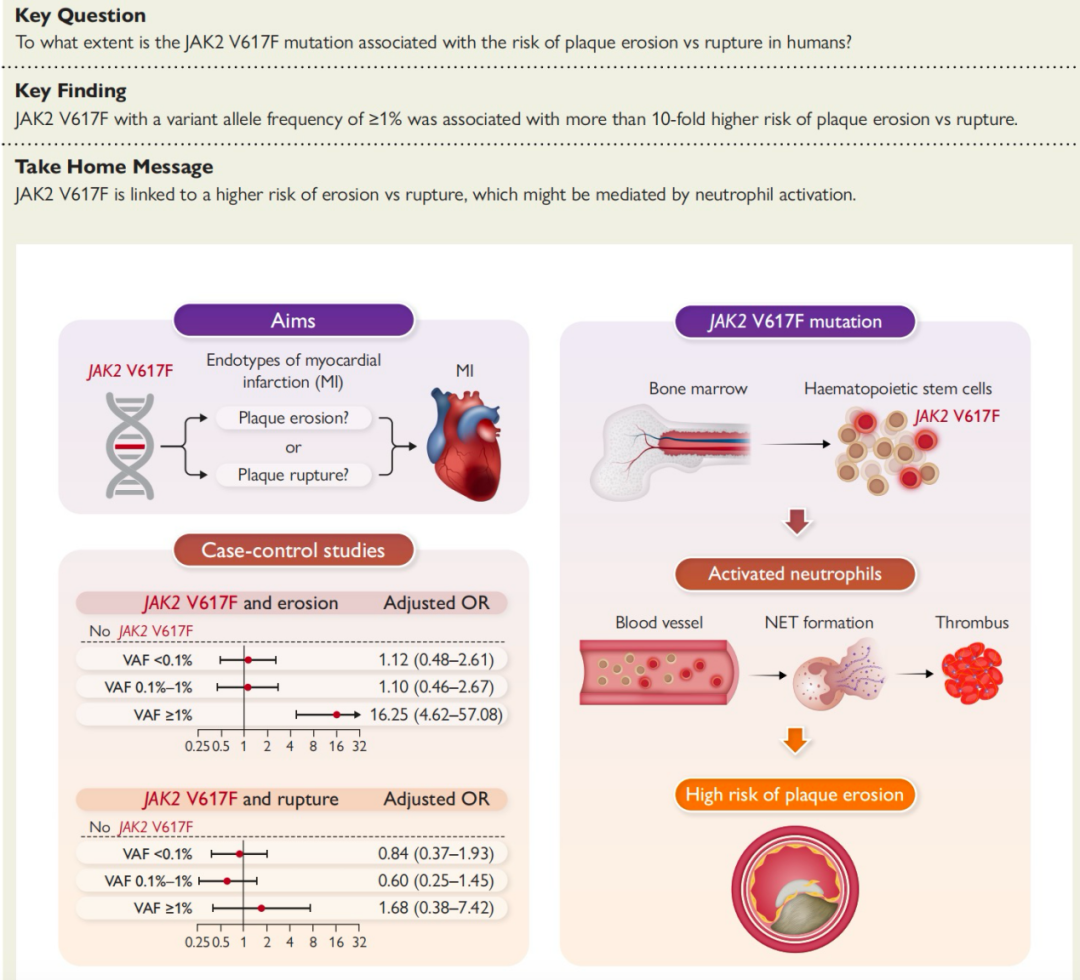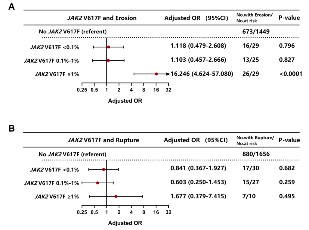 通过病例-对照研究,团队分析了 JAK2 V617F 突变与斑块侵蚀或破裂的相关性。结果显示,JAK2 V617F 突变(VAF≥1%)使斑块侵蚀的发生风险增加了 10 倍以上,但与斑块破裂无显著相关性。