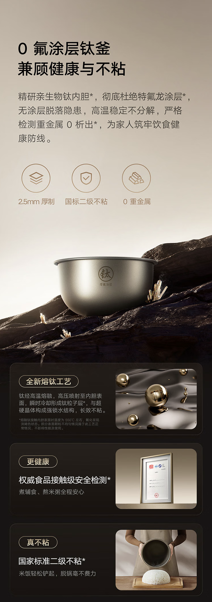 该电饭煲采用亲生物钛内胆,不含特氟龙涂层,整体厚度 2.5mm,号称“0 重金属”、“国标二级不粘”。