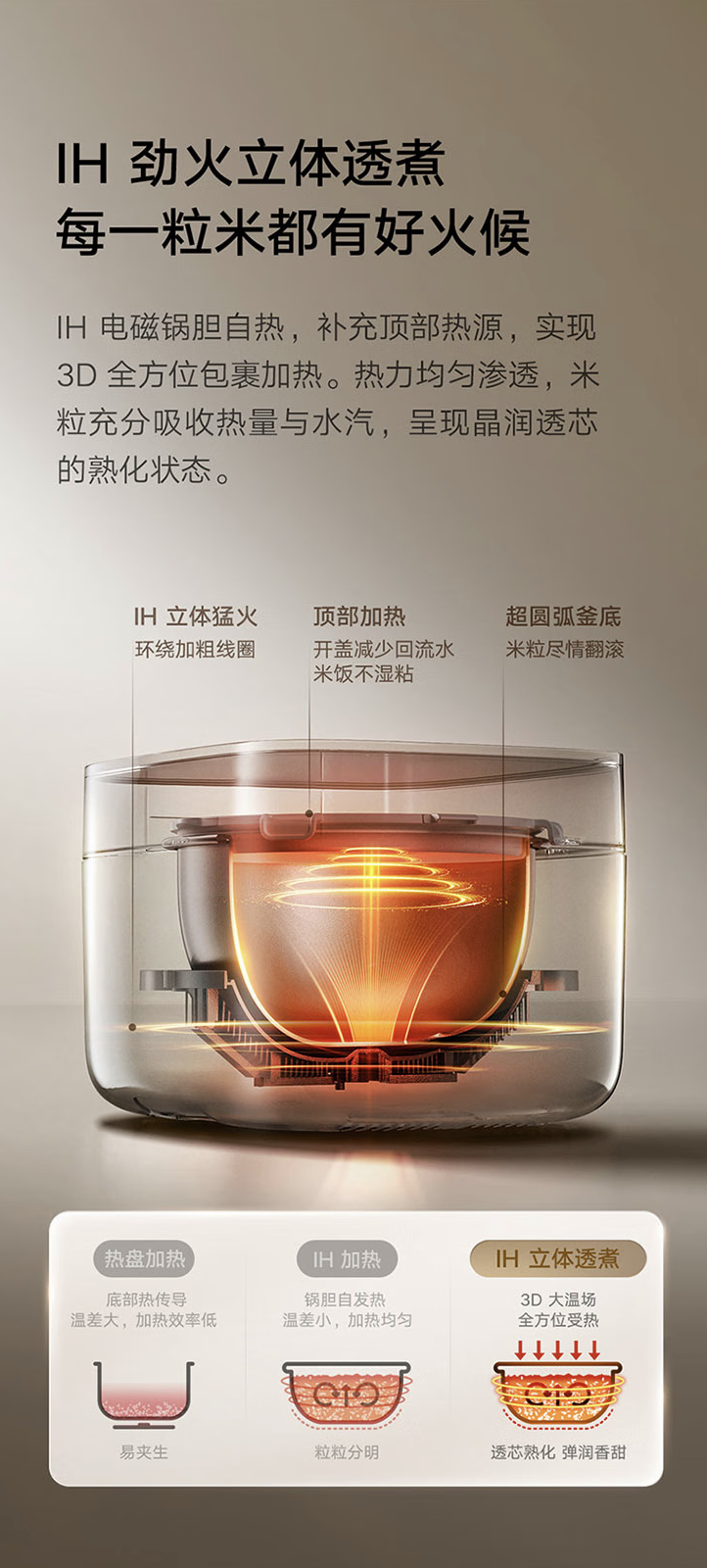 此外,该电饭煲拥有 1.2 倍压力,支持“IH 劲火立体透煮”,同时配备“满分煮”烹饪曲线,支持 3D 全方位包裹加热。