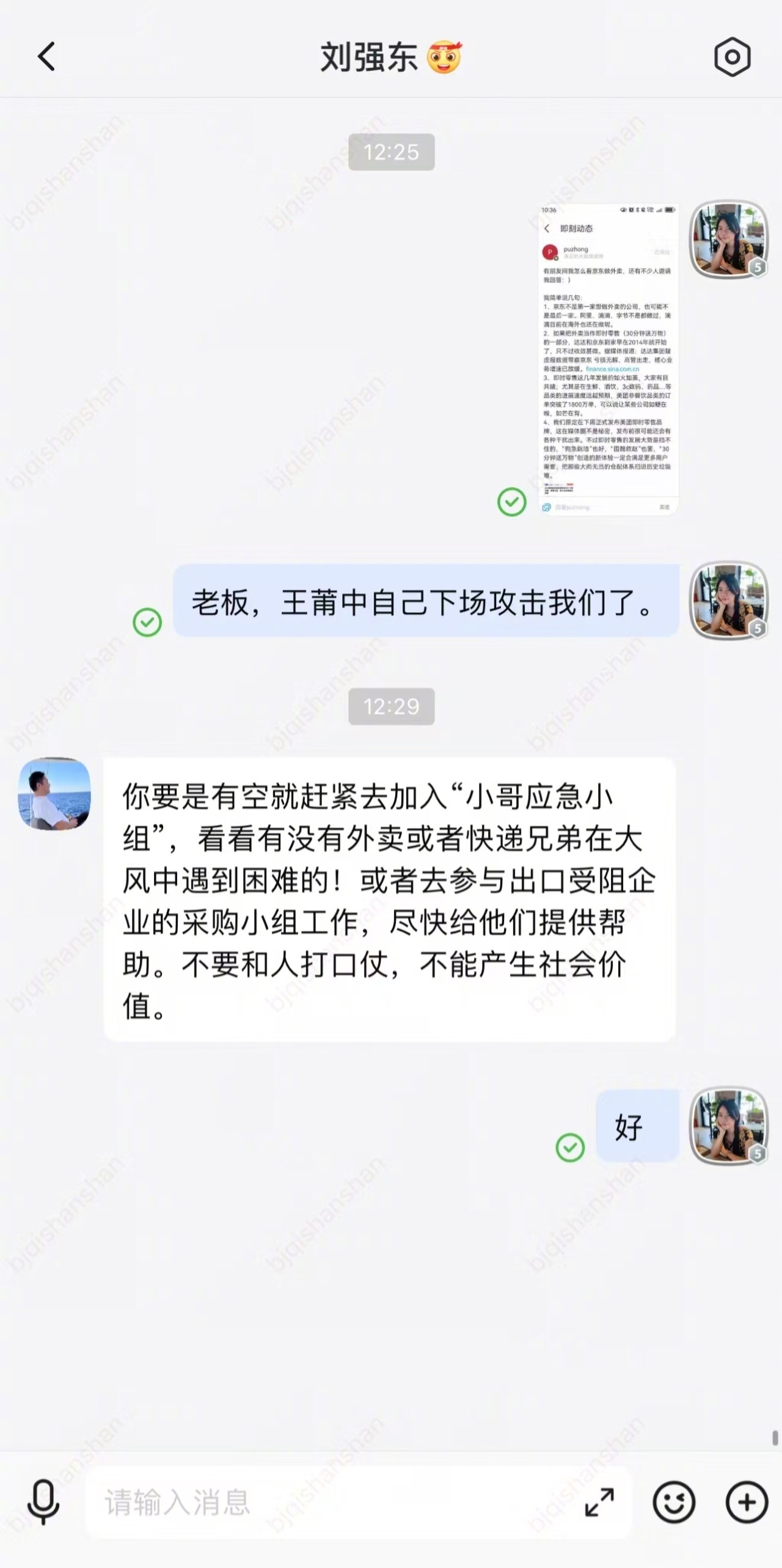 截图显示,刘强东本人得知今日早间王莆中的言论回应称:要是有空就赶紧去加入“小哥应急小组”,看看有没有外卖或者快递兄弟在大风中遇到困难的!或者去参与出口受阻企业的采购小组工作,尽快给他们提供帮助。此外,刘强东还表示,“不要和人打口(水)仗,不能产生社会价值。”