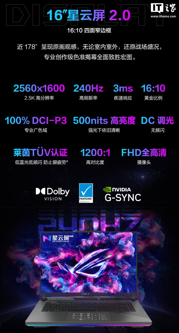 据介绍,华硕 ROG 魔霸 9 游戏本配备 16 英寸星云屏 2.0,其比例为 16:10、分辨率 2560×1600、支持 240Hz 高刷、3ms 响应。该屏幕覆盖 100% DCI-P3 色域、拥有 500nits 亮度、1200:1 对比度。
