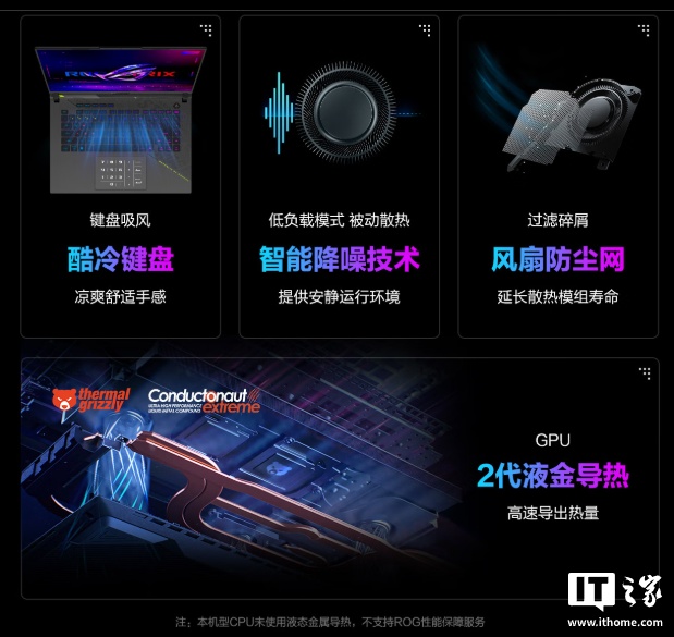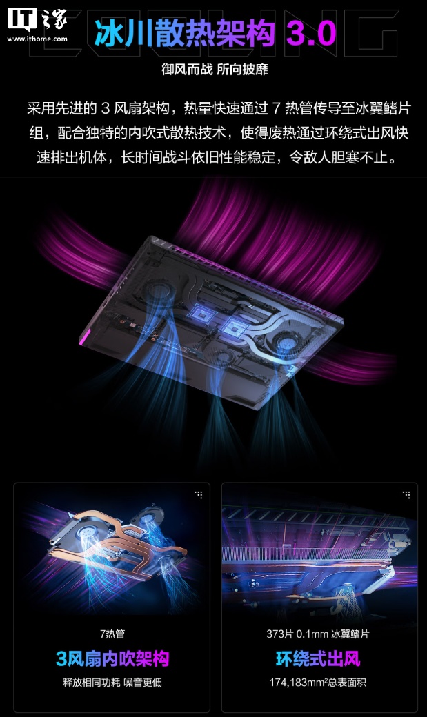 华硕 ROG 魔霸 9 游戏本采用 3 风扇结构,配备 7 热管,同时内置 373 片 0.1mm 冰翼鳍片,支持环绕式出风(174,183mm² 总表面积)。笔记本还支持键盘吸风、智能降噪技术(低负载模式、被动散热),配备风扇防尘网(过滤碎屑、延长散热模组寿命)。
