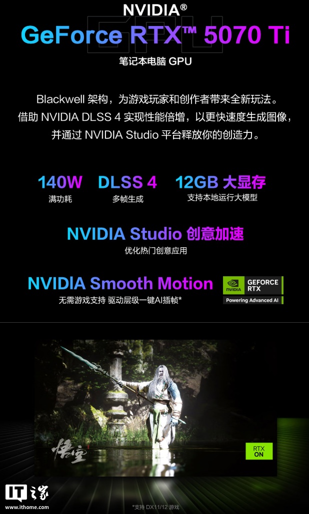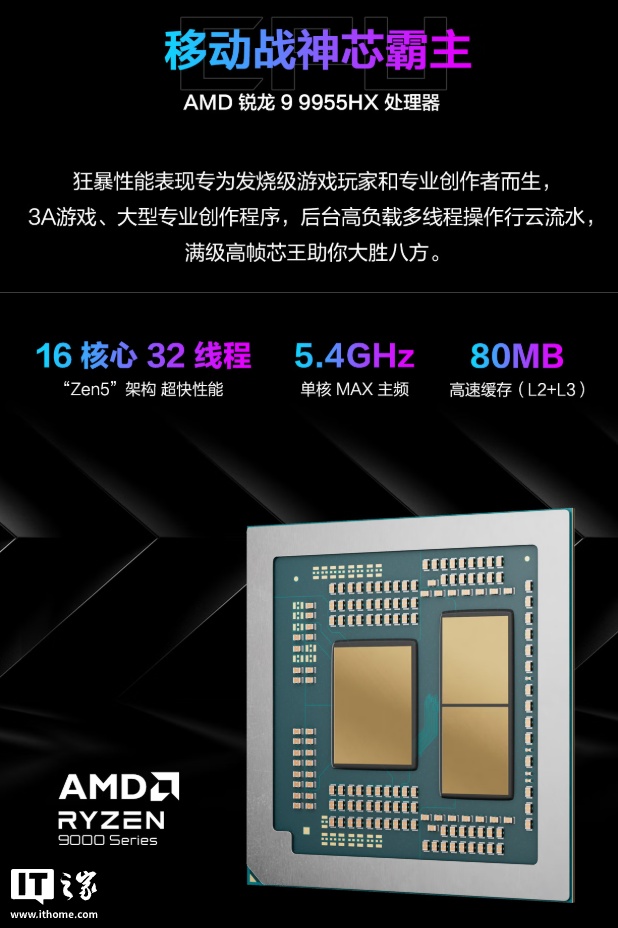 新款笔记本搭载 AMD 锐龙 9 9955HX 处理器(16 核心 32 线程、5.4GHz 单核 MAX 主频、80MB 高速缓存)+ RTX 5070 Ti 笔记本电脑 GPU(140W 满功耗、DLSS 多帧生成、12GB 显存、NVIDIA Studio 创意加速、NVIDIA Smooth Motion),支持双显三模热切换(独显输出、混合输出、集显模式、自动调节)。