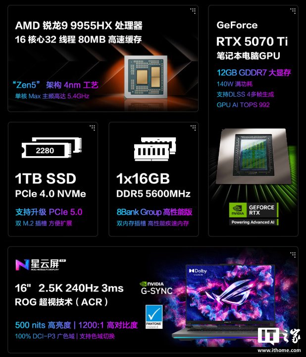 IT之家 4 月 12 日消息,华硕 ROG 魔霸 9 游戏本现已发布并上架京东开启预约,新机搭载 AMD 锐龙 9 9955HX 处理器 + RTX 5070 Ti 独显,配备 16GB DDR5 + 1TB PCIe 4.0 SSD,售价 14999 元。