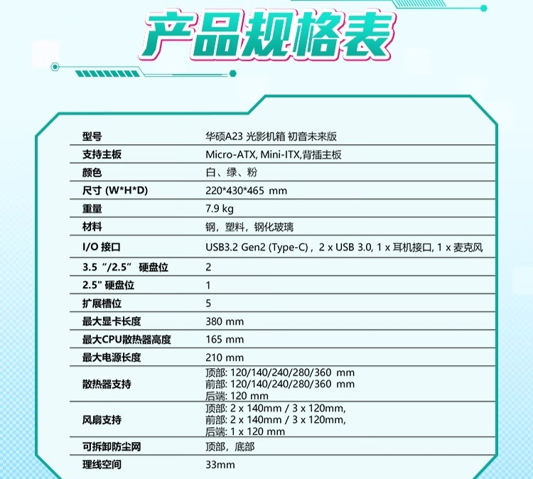 这款机箱采用了初音未来苍绿配色定制设计,包括定制 MIKU 剪影立绘,还有深度定制的领带式样耳机挂架、洞洞板音符配饰,DIY 面板支持任意改装,号称“次元谷仓”。