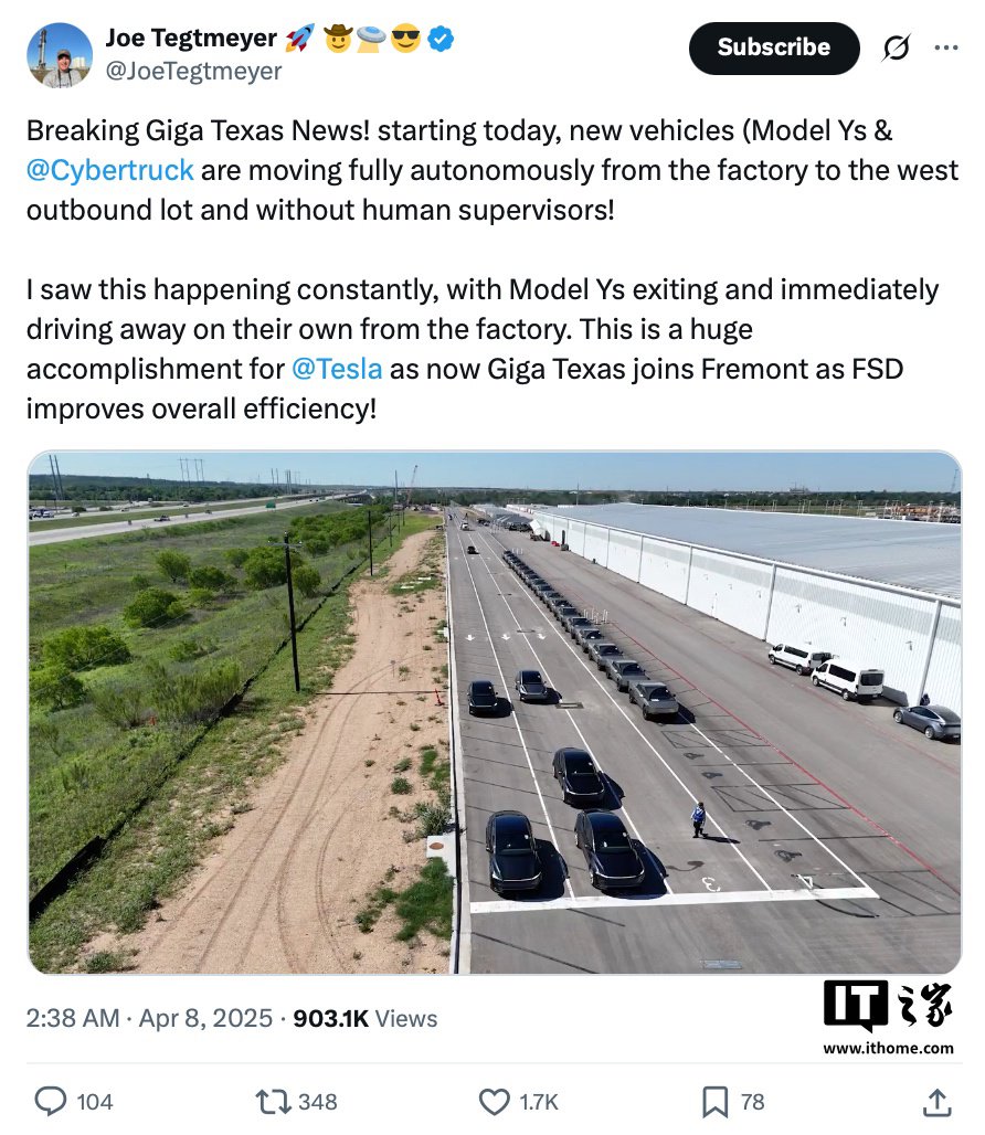 参考IT之家先前报道,近期特斯拉悄悄为得州奥斯汀超级工厂生产的新款 Model Y 和 Cybertruck 车型部署“自动行驶至出厂区”功能,让这些汽车在无需监督的情况下自动下产线开入交付车辆停车场,以便于降低人力成本,并向业界展示其为自动驾驶出租车持续做准备的决心。