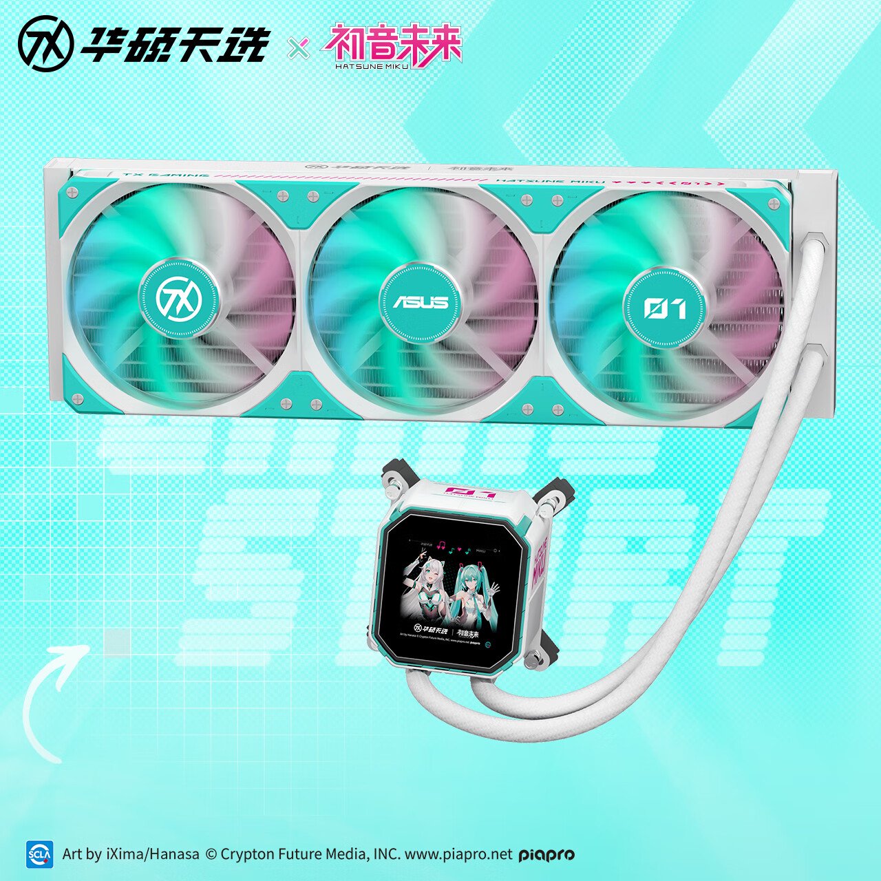 IT之家 4 月 13 日消息,华硕在昨日的 ROG LAB 新品发布会上推出了天选 360 LCD 水冷初音未来版散热器(IT之家注:型号 TX GAMING LC III 360 ARGB LCD Miku Edition)。作为初音未来联名硬件的一员,该一体式水冷进行了深度定制。