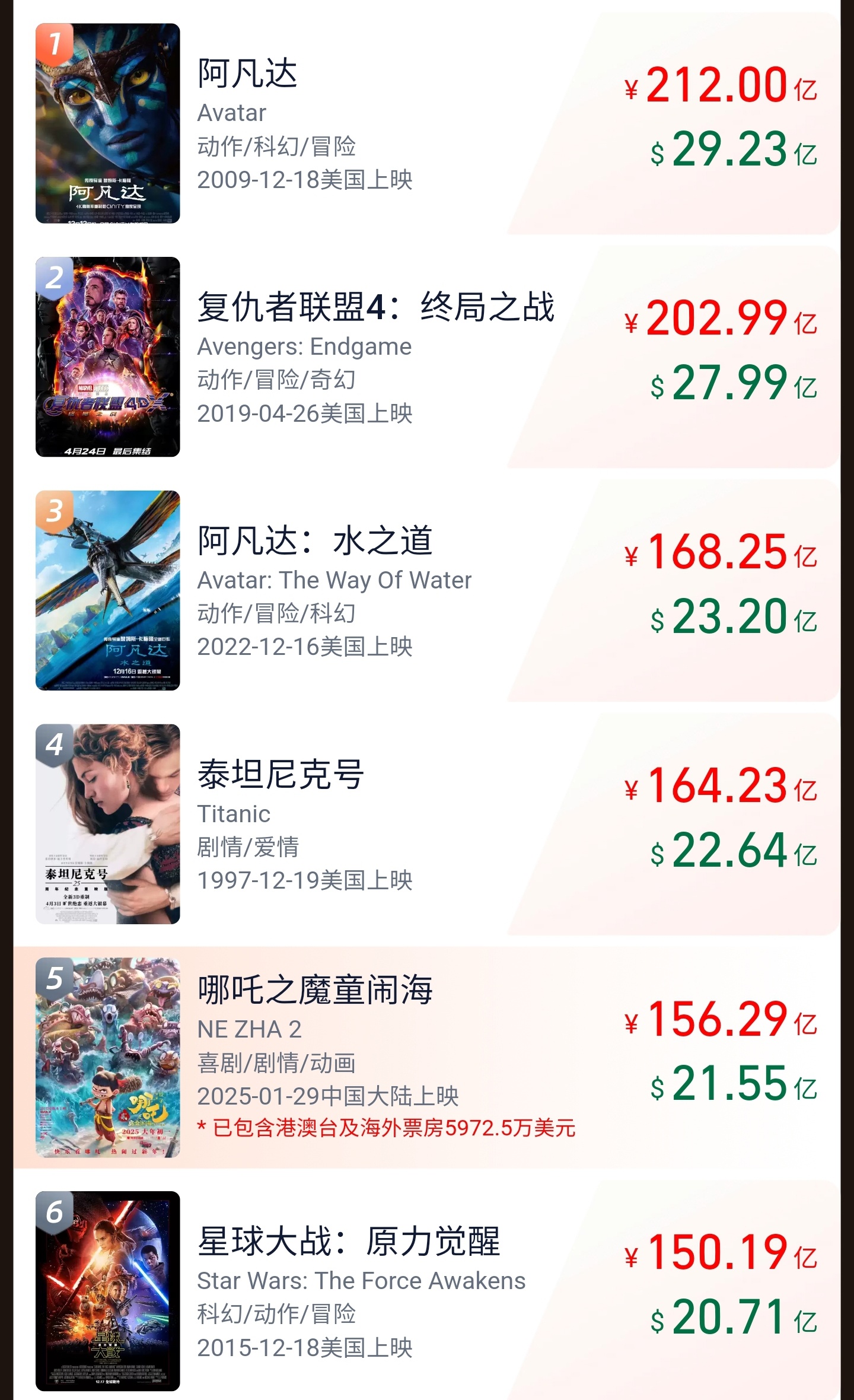 截至今日,《哪吒之魔童闹海》已经上映 75 天,全球影史票房榜暂列第五,总票房达到 156.29 亿元,其中港澳台及海外票房 5972.5 万美元(现汇率约合 4.36 亿元人民币),排在其前面的是 164.23 亿票房的《泰坦尼克号》。