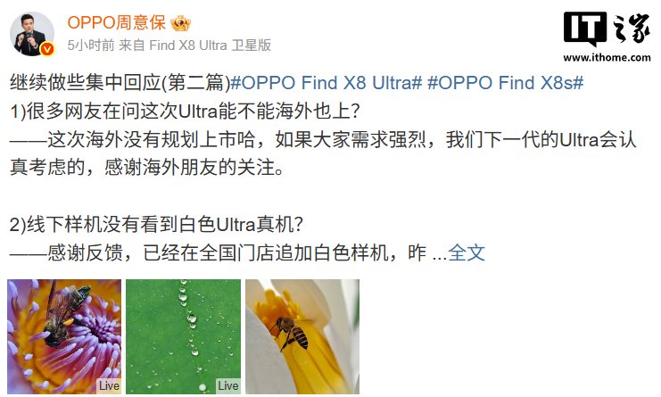 IT之家 4 月 13 日消息,OPPO Find 系列产品负责人周意保今日发文集中回应了部分网友的问题,包括 Ultra 机型是否准备在海外上市、X8s 系列机型是否适配凝光影像 LUMO、是否会推出不带卫星通信的 X8 Ultra 顶配版本。