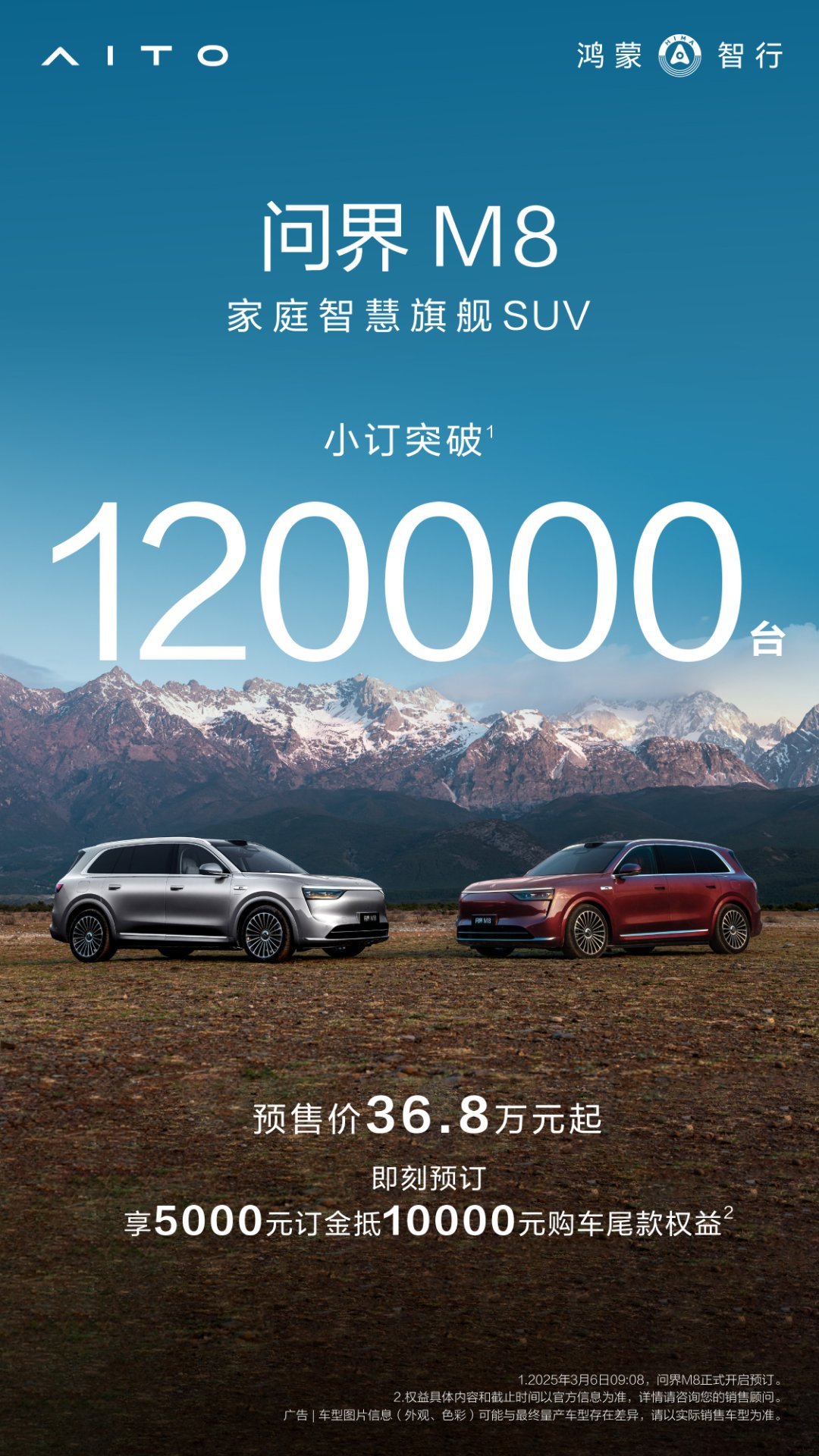 IT之家 4 月 13 日消息,据多位微博用户 / 博主分享,“家庭智慧旗舰 SUV”鸿蒙智行问界 M8 汽车小订突破 12 万台。该车预售价 36.8 万元起。