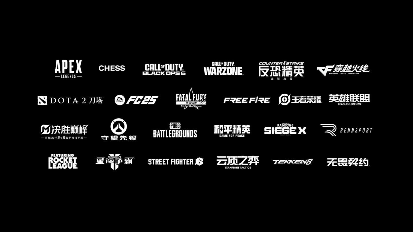 Apex 英雄、使命召唤:黑色行动 6、使命召唤:战争地带、国际象棋、反恐精英:全球攻势、穿越火线、刀塔、EA Sports FC 25、饿狼传说:群狼都市、Free Fire、王者荣耀、英雄联盟、决胜巅峰、守望先锋、绝地求生、和平精英、彩虹六号:围攻 X、Rennsport、火箭联盟、星际争霸 2、街头霸王 6、英雄联盟:云顶之弈、铁拳 8、无畏契约。