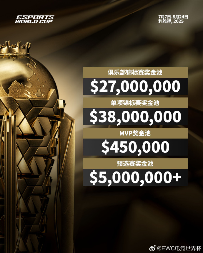 预选赛奖金池:超 500 万美元(现汇率约合 3648.5 万元人民币),用于“Road to EWC”系列赛,争夺 2025 电竞世界杯的入场券。