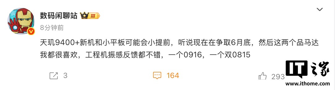 IT之家 4 月 14 日消息,博主 @数码闲聊站透露一款神秘“天玑 9400 + 新机”和“小平板”档期将提前至 6 月底上市,综合博主透露“两款机型分别配备 0916 / 双 0815 马达”及评论区用户,预计相应产品为小米 REDMI K80 至尊版和 8.8 英寸 REDMI 电竞小平板。