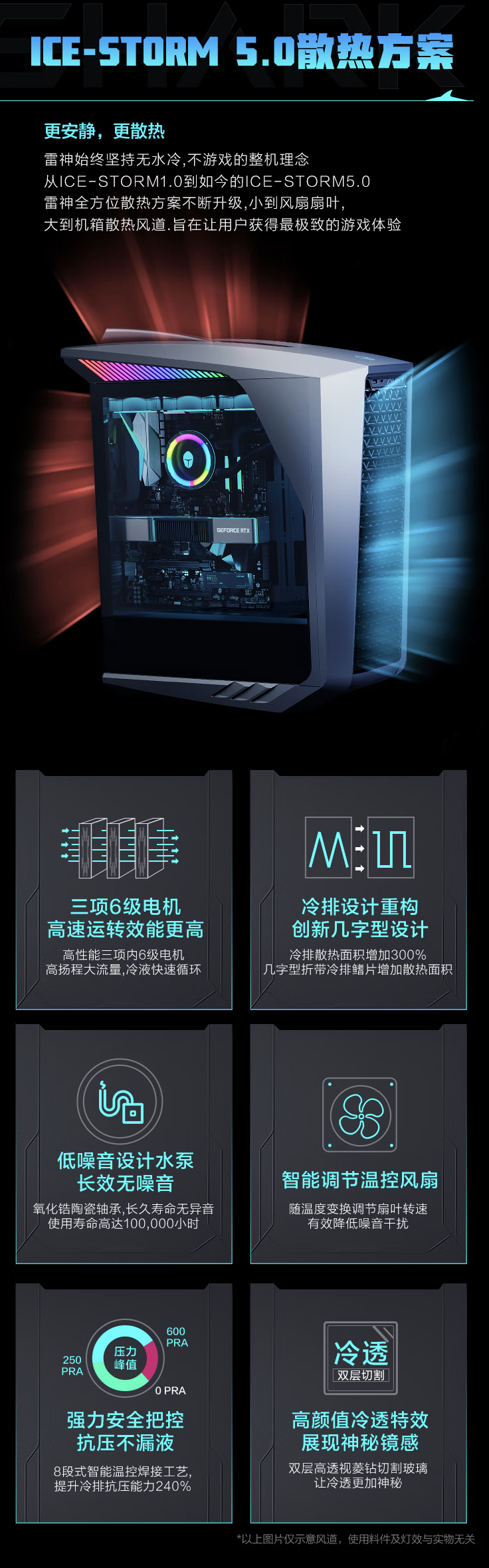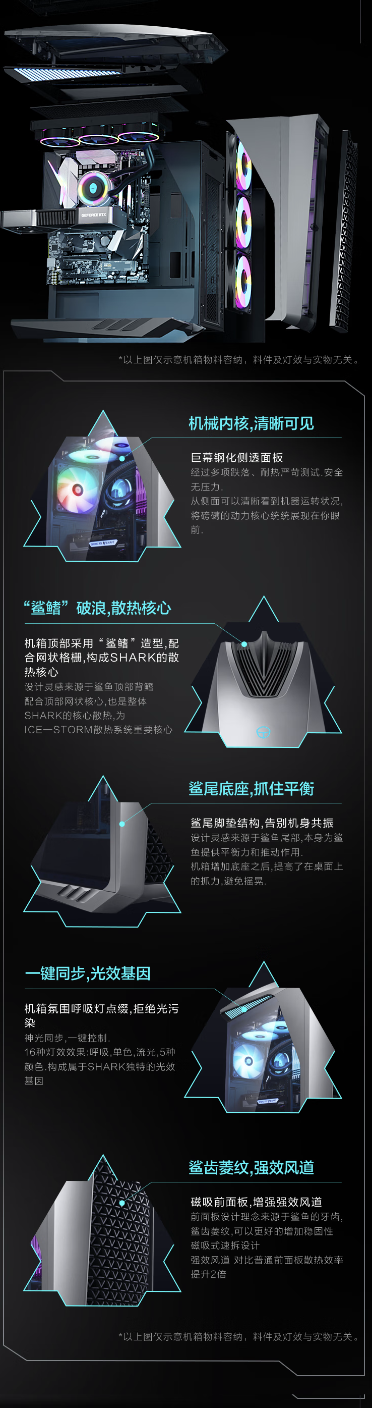 ▲ 本图系 RTX5070 Ti 版本IT之家注意到,该主机机箱采用黑鲨语言设计,鲨齿状菱纹咬花风道格栅、两侧鳃状隐藏氛围灯、新生蓝 LOGO、顶部“鲨鳍破浪”设计鱼鳍造型、玻璃侧透面板,配合四组叠拼三角格栅风口,支持软件神光同步调参。