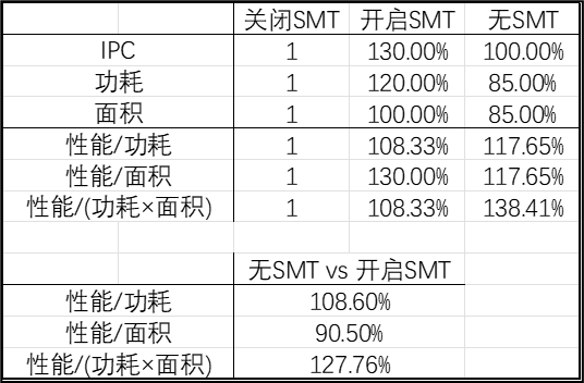 Ori Lempel 表示,根据经验估算数据,相较硬件上支持超线程 / 同步多线程 (SMT) 但关闭这一功能的核心,开启超线程能提升 30% 的 IPC 但会增加 20% 的功耗,而硬件设计上不支持超线程的核心能在相同 IPC 下降低 15% 的功耗和 15% 的面积占用。