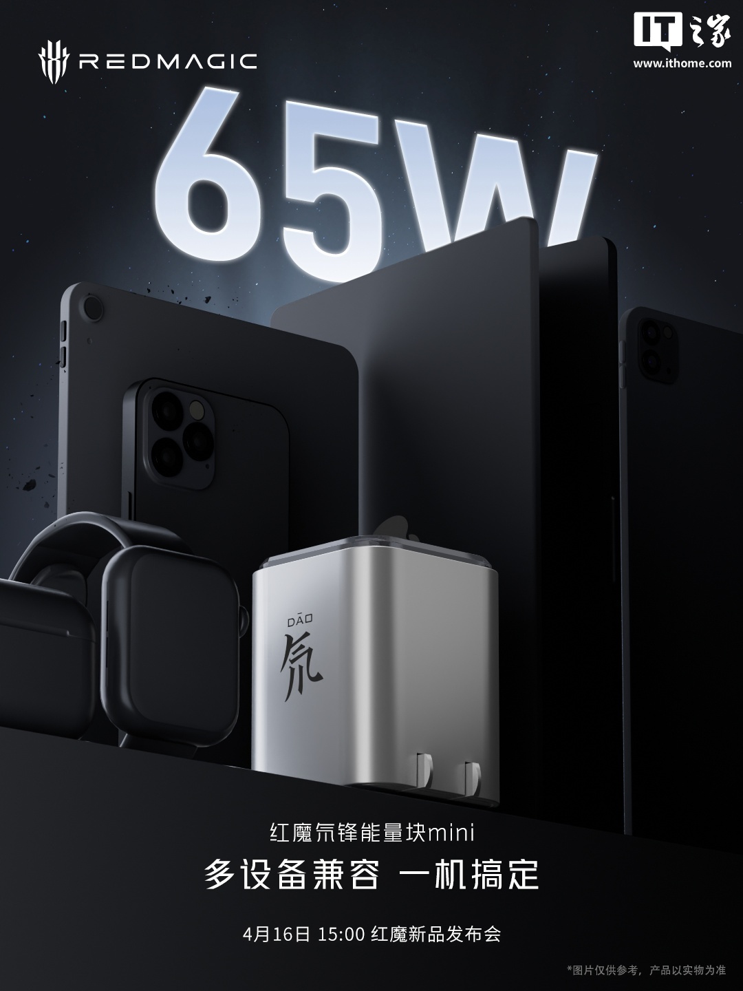 此外,红魔还将带来氘锋能量块 mini 充电器,采用家族式设计风格,配备可折叠插脚,支持 65W 快充。海报还展示了平板、手机、手表等产品,结合海报“多设备兼容”字样来看,新品预计将兼容多品类设备使用。