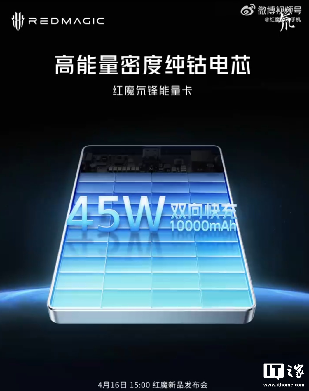 IT之家 4 月 14 日消息,红魔 10 Air 新品发布会已官宣定档 4 月 16 日 15:00,除了手机产品外,红魔氘锋能量卡充电宝也会同步发布。这款新品搭载高能量密度纯钴电芯,支持 45W 双向快充,配备 10000mAh 电池容量。