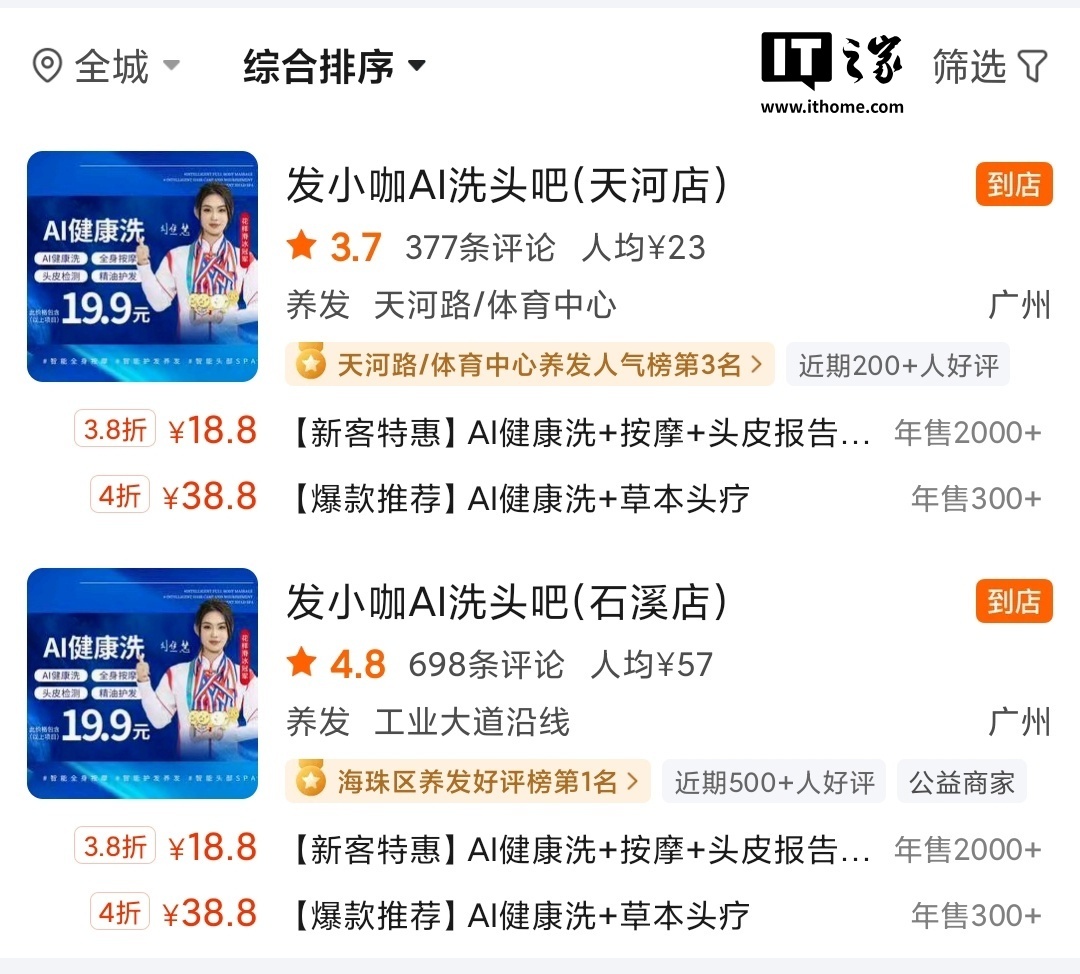 IT之家查询获悉,目前在广州的天河区、海珠区、白云区、黄埔区、花都区等都有相关业务的店铺,除了 AI 洗头,一般还会有搭配的按摩、养护、头疗业务,人均消费几十元不等。