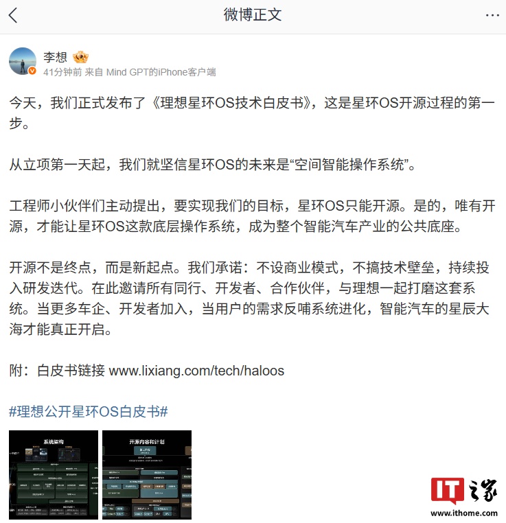 IT之家 4 月 15 日消息,理想汽车今日发布《理想星环 OS 技术白皮书》,该白皮书系统阐述汽车操作系统定义、分析发展趋势,结合创新场景案例,详细介绍理想星环 OS 技术架构及核心系统,并公开其开源计划。