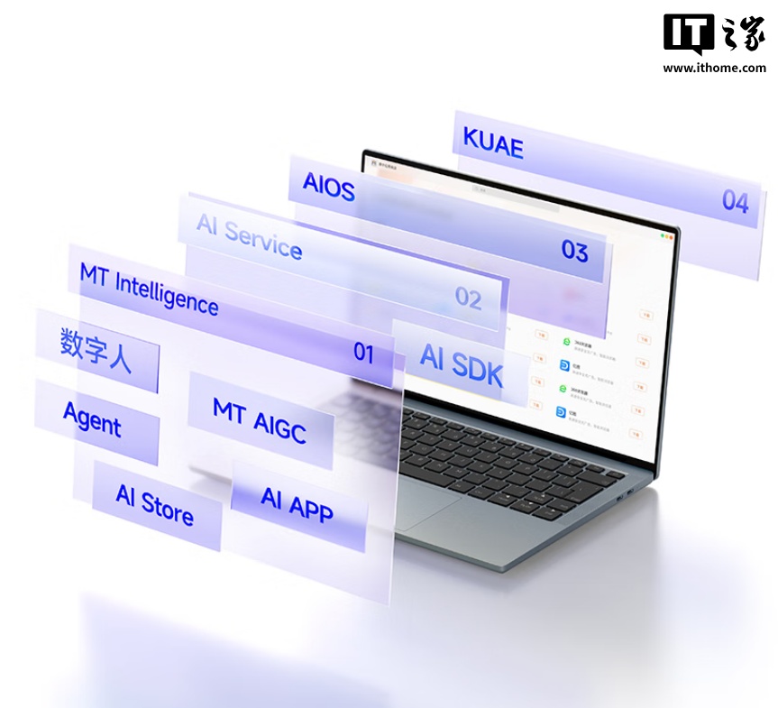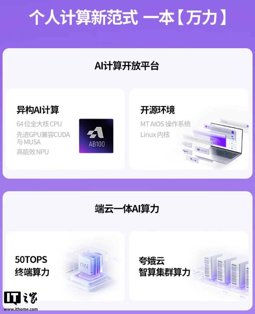 AIBOOK 算力本配备 32GB 统一内存,1TB SSD 存储;拥有端侧 50 TOPS 最高算力,支持主流开源大模型,最高可搭载 32B 本地大模型;配有 AB100 全大核 64 位平台,运行基于 Linux 内核的 MT AIOS 操作系统。