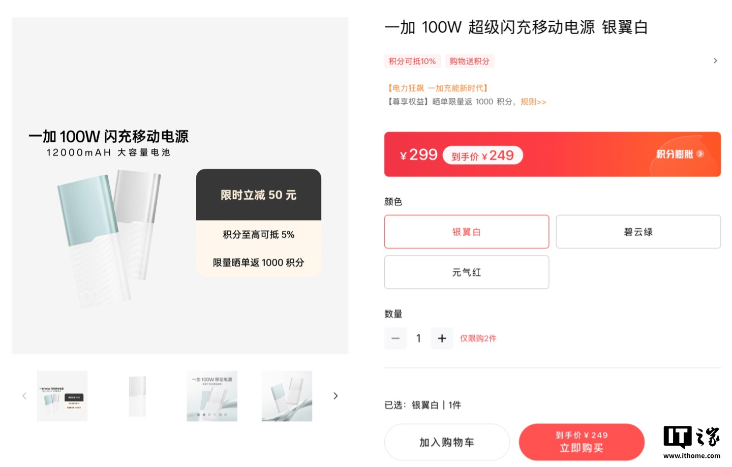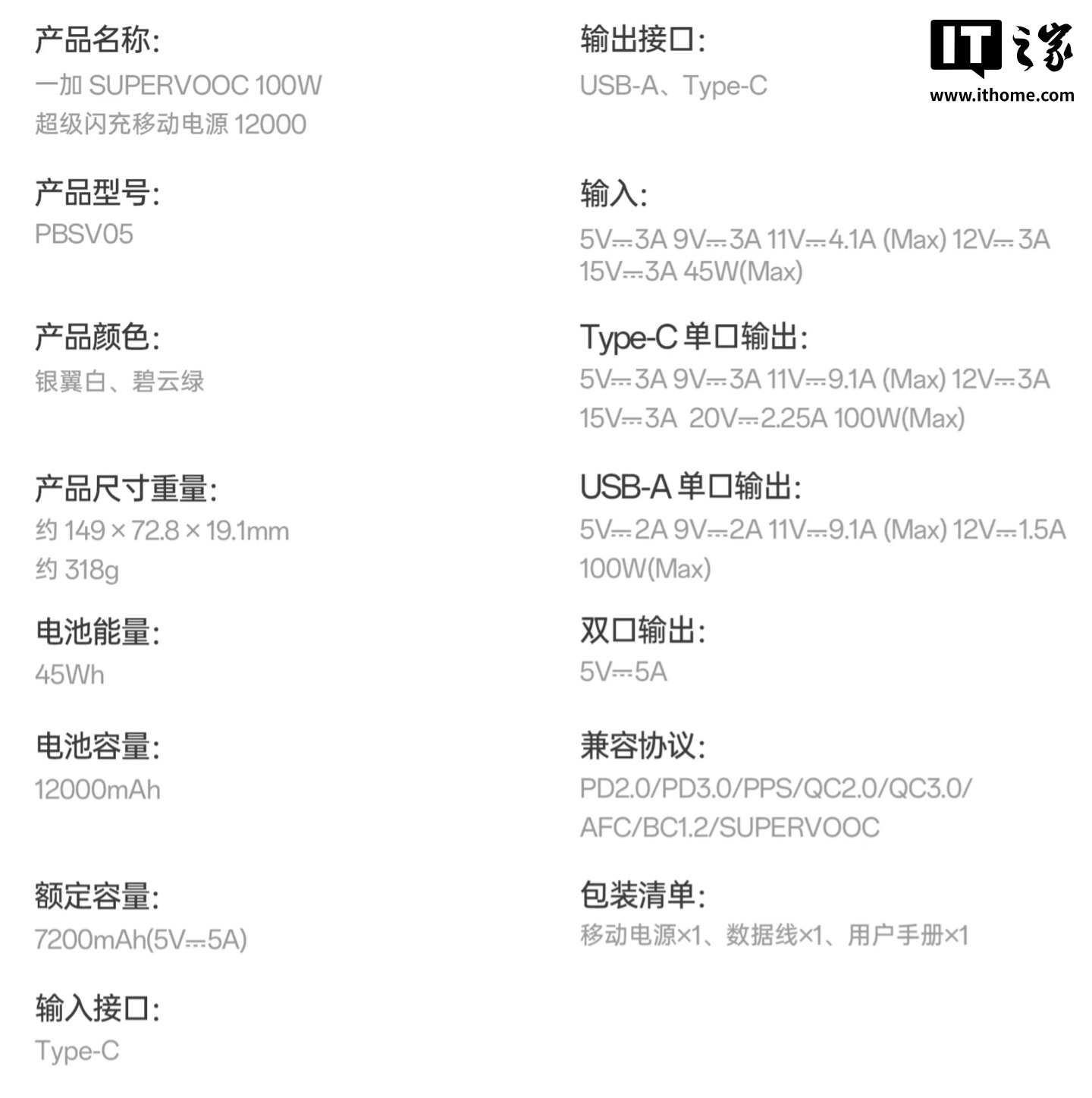 作为比较,IT之家获悉一加目前在售的 100W 闪充移动电源拥有 12000 毫安时容量(额定容量 7200 毫安时),配备 1 个 USB-A 100W 接口、1 个 USB-C 100W 接口,日常价 299 元。