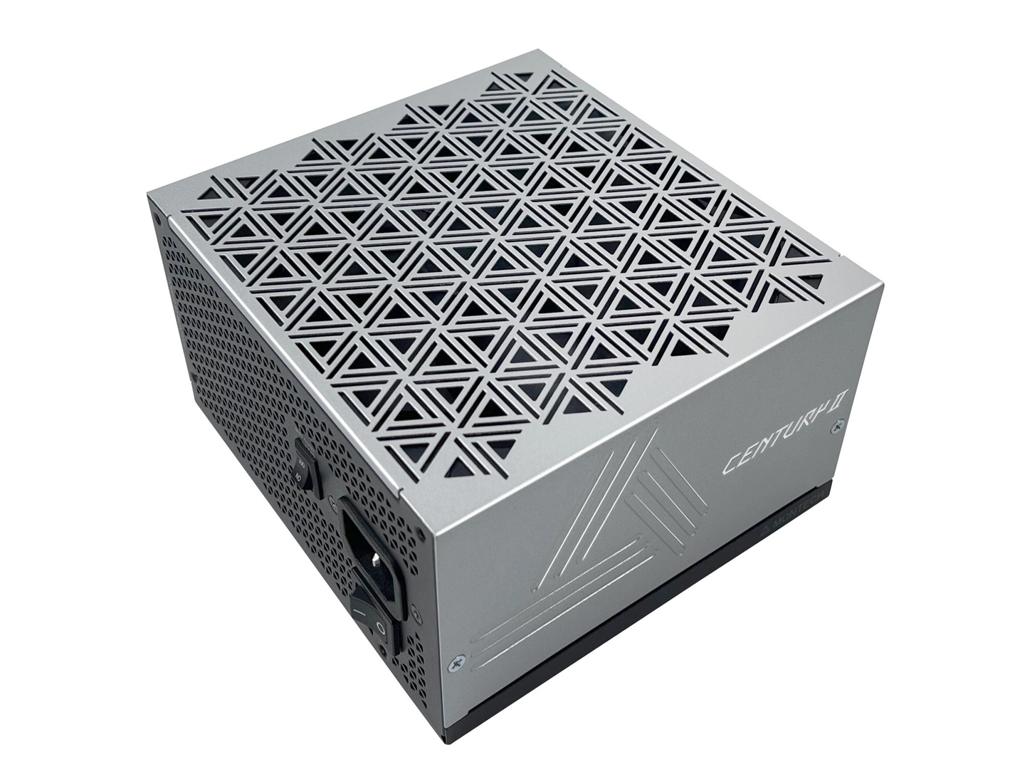 MONTECH CENTURY II 系列电源外部采用简约银灰配色机身,顶部透风镂空采用的是该企业标志性的双层三角形设计,在一众纯黑色电源供应器中引人注目。