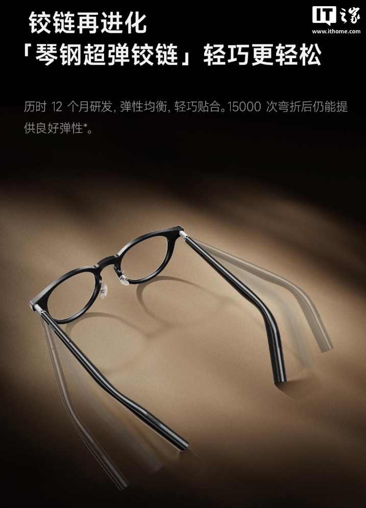MIJIA 智能音频眼镜 2 采用轻量化设计,重约 27.6g(深空钛款、不含衬片的重量),其铰链也得到升级,宣称 15000 次弯折后仍能提供良好弹性。