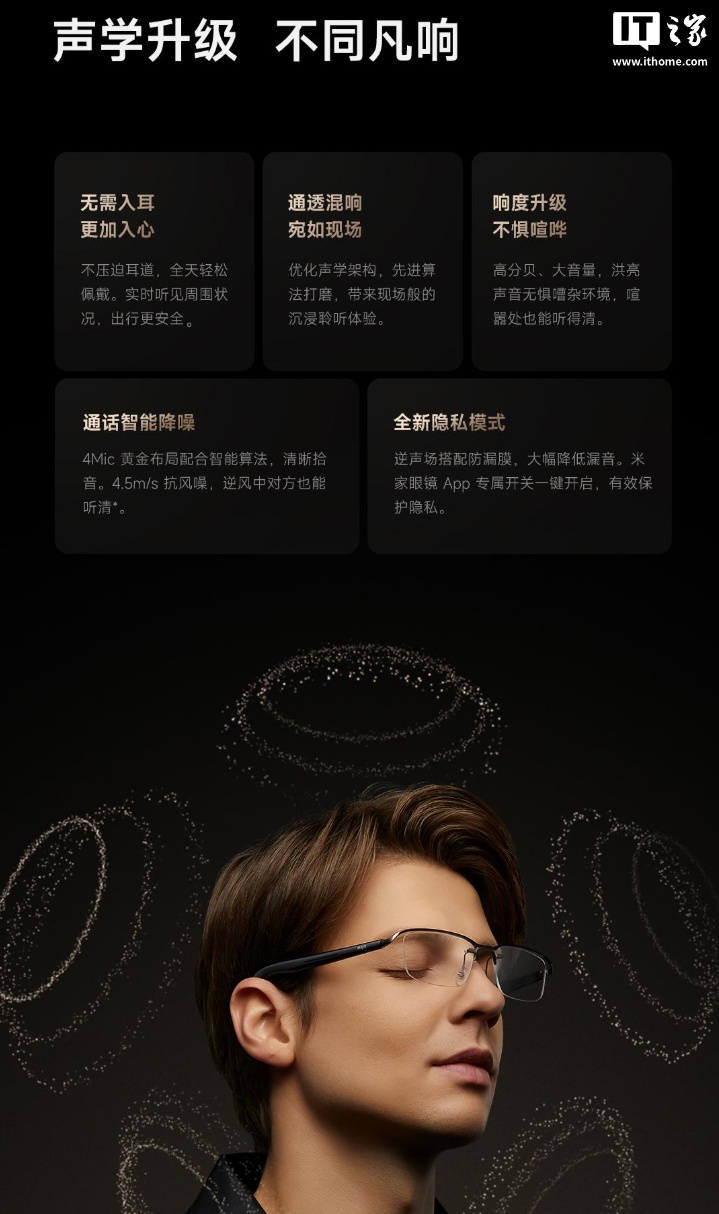 MIJIA 智能音频眼镜 2 采用开放声场设计,优化了声学架构、并升级响度,支持通话智能降噪(4.5m/s 抗风噪)、全新隐私模式(米家眼镜 App 专属开关一键开启)。新品还提供双设备连接、通知播报、双设备录音等功能。