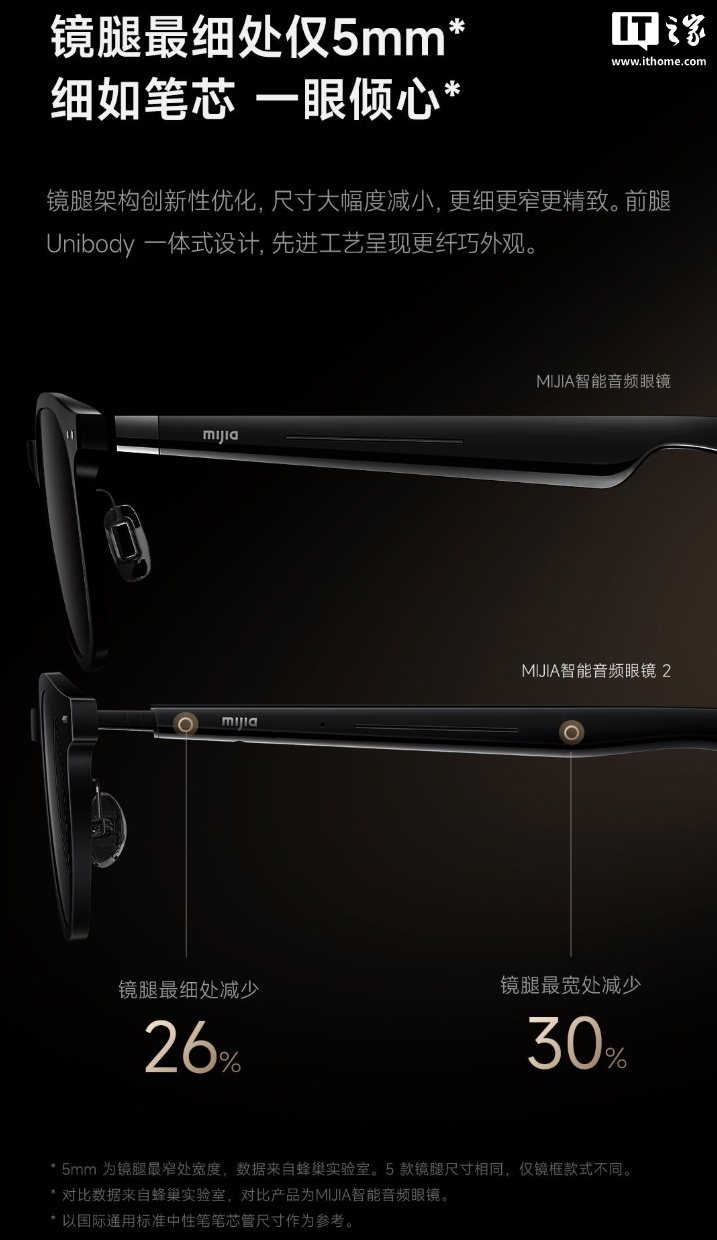 据介绍,小米 MIJIA 智能音频眼镜 2 镜腿架构得到优化,尺寸“大幅度减小”,最细处仅 5mm。眼镜前脚采用 Unibody 一体式设计,宣称镜腿最细处减少 26%、最宽处减少 30%。