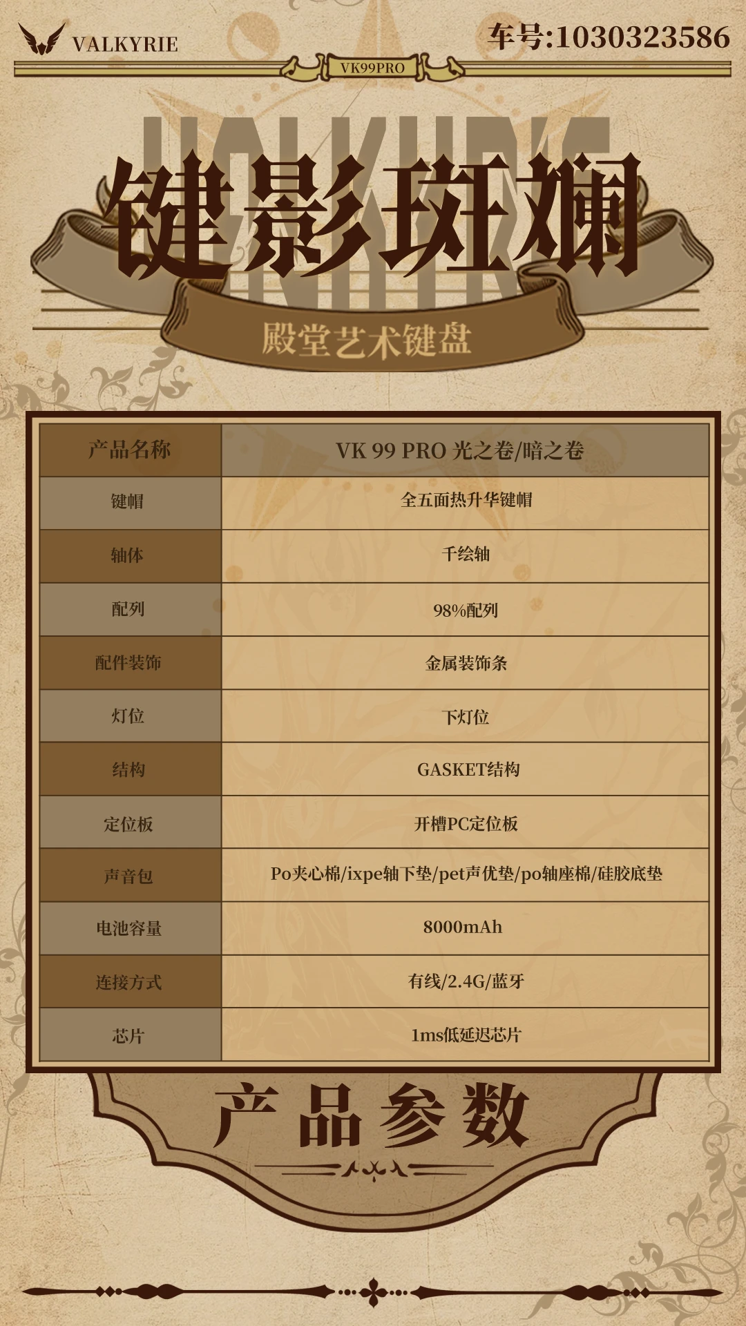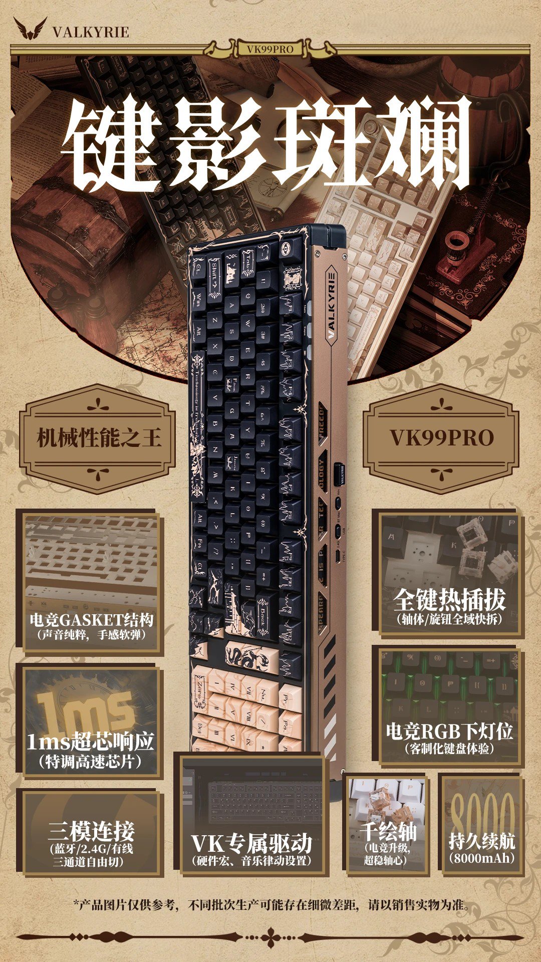 IT之家 4 月 15 日消息,瓦尔基里本月 13 日对即将推出的 VK 99 Pro“键影斑斓”三模机械键盘进行了预热。该系列键盘可选“光之卷”“暗之卷”两种不同变体,均为“罗马风格”。
