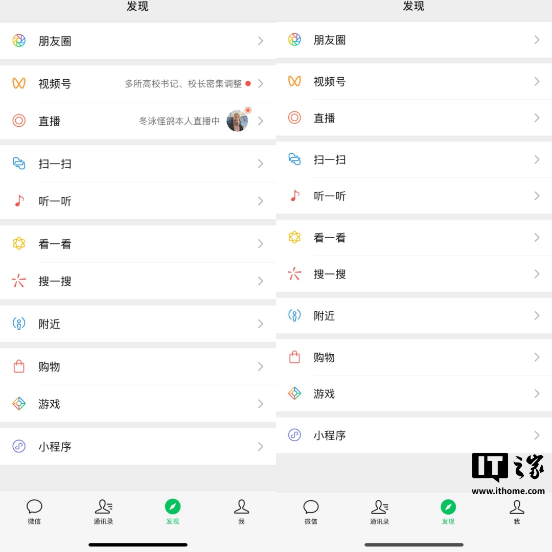 对比更新前后的“发现”界面,可以看出选项的位置高度出现了调整,且字体更为清晰。