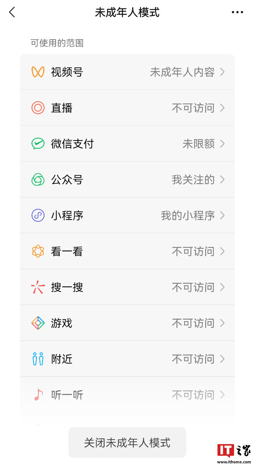 开启该模式后,看一看、听一听等功能将不可访问,表情、视频号等功能将受限制使用,需监护人主动设置。
