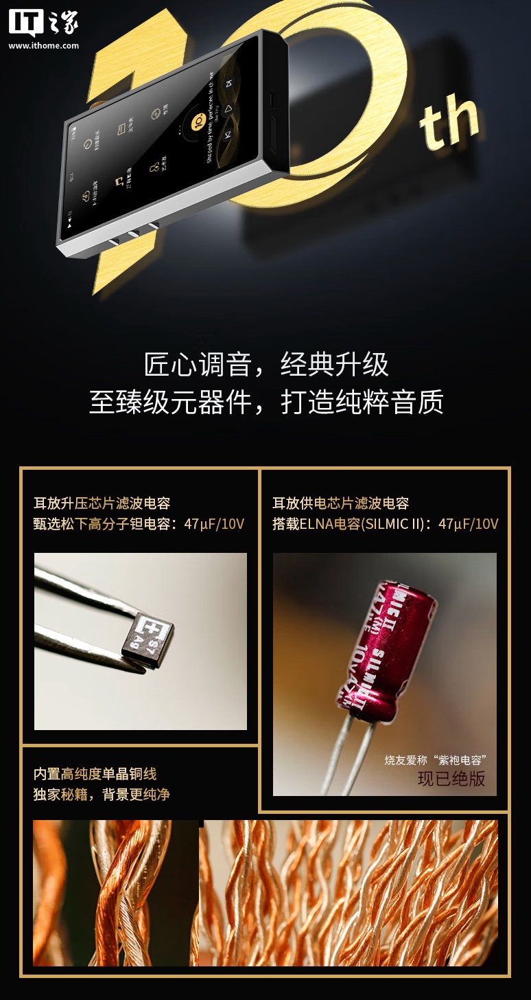 在设计方面,这款 M5 Ultra 十周年纪念版播放器可以看作是原版 M5 Ultra 播放器更换配色,同时引入了黑金风格 UI,播放器“表冠”部分内置氛围灯,配备 4.7 英寸 1280 x 720 分辨率触摸屏,重量为 247 克。