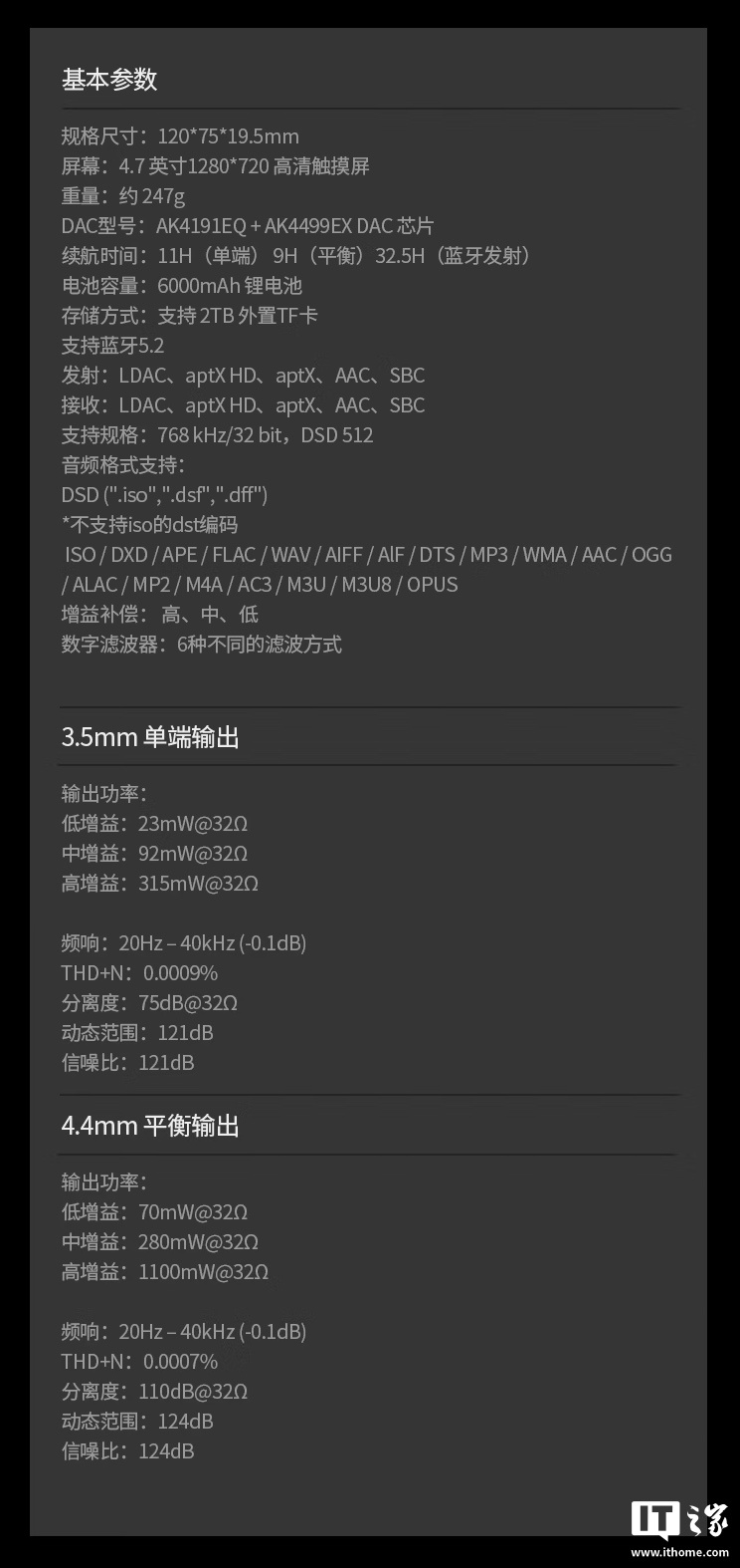 规格方面,该播放器配备 AK4191+AK4499EX 双 DAC,配备蓝牙 5.2 技术,支持 LDAC 及 aptX HD 音乐传输协议,深度待机续航至高 528 小时。