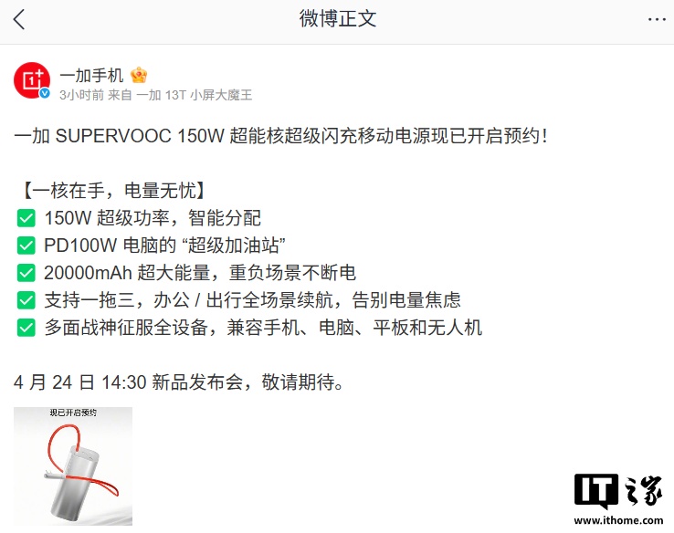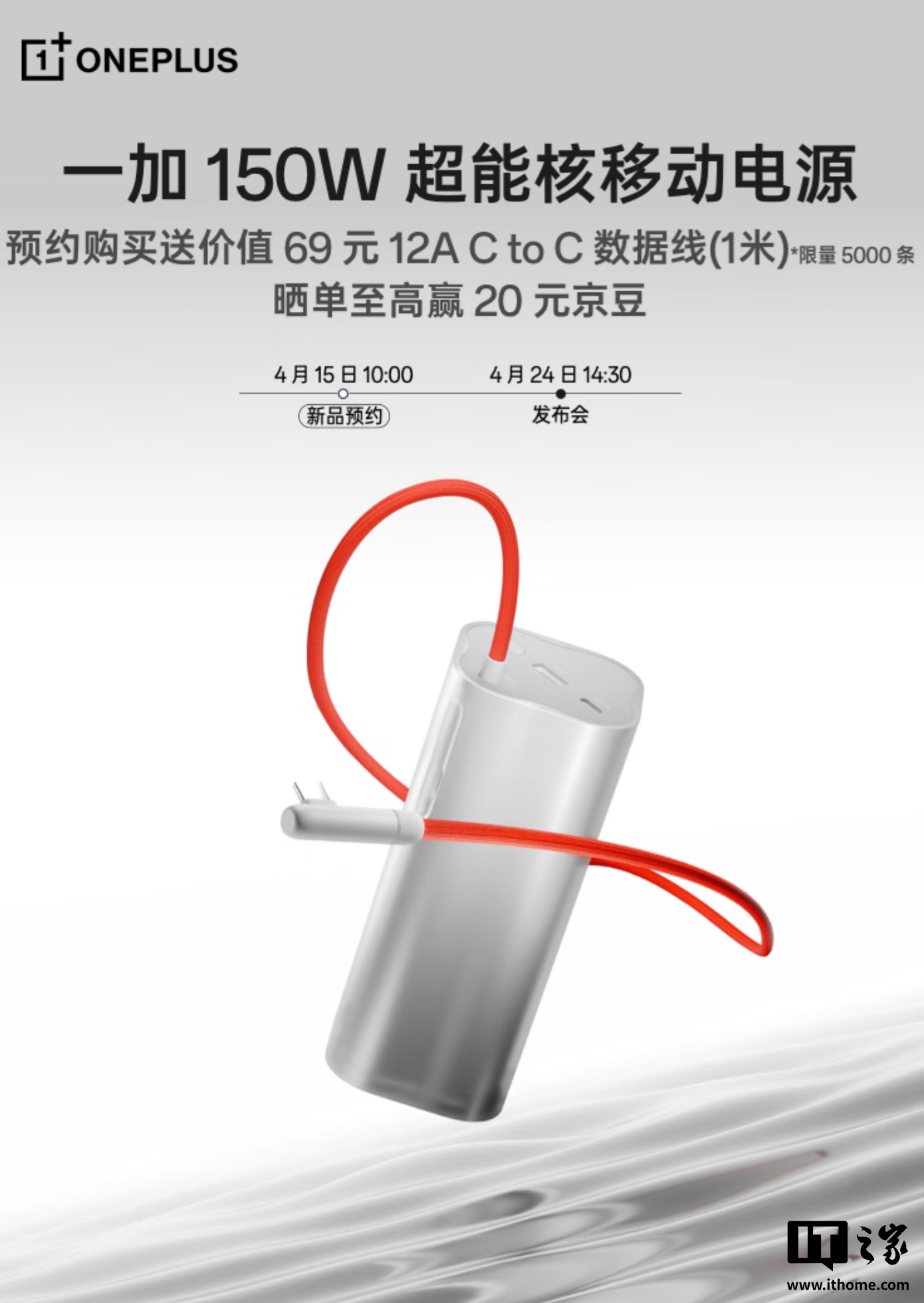 IT之家 4 月 15 日消息,一加今日在京东上架 SUPERVOOC 150W 超能核移动电源,这款移动电源将于 4 月 24 日 14:30 发布会中亮相,具体价格尚未公布。