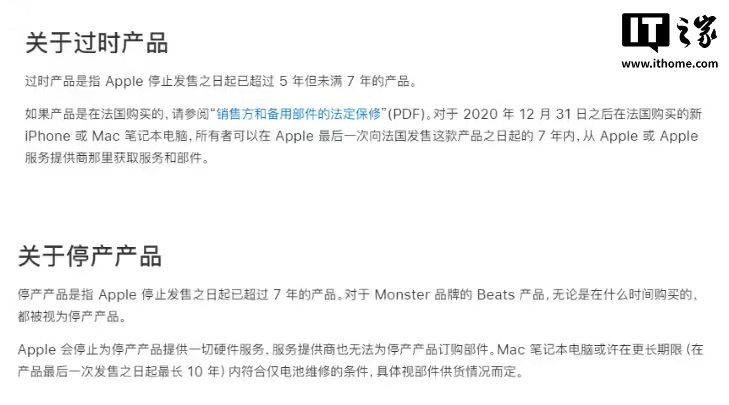 据IT之家了解,根据苹果公司的定义,一款设备在停止销售五年后被归类为“过时(Vintage)”。对于过时产品,苹果零售店和苹果授权服务提供商(AASP)仍可提供维修服务,但前提是所需零部件仍有供应。