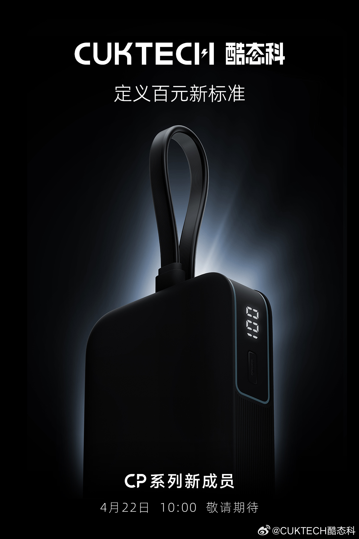 IT之家 4 月 16 日消息,酷态科官方今日宣布将于 4 月 22 日发布一款移动电源新品,slogan 为“CP 系列新成员,定义百元新标准”。