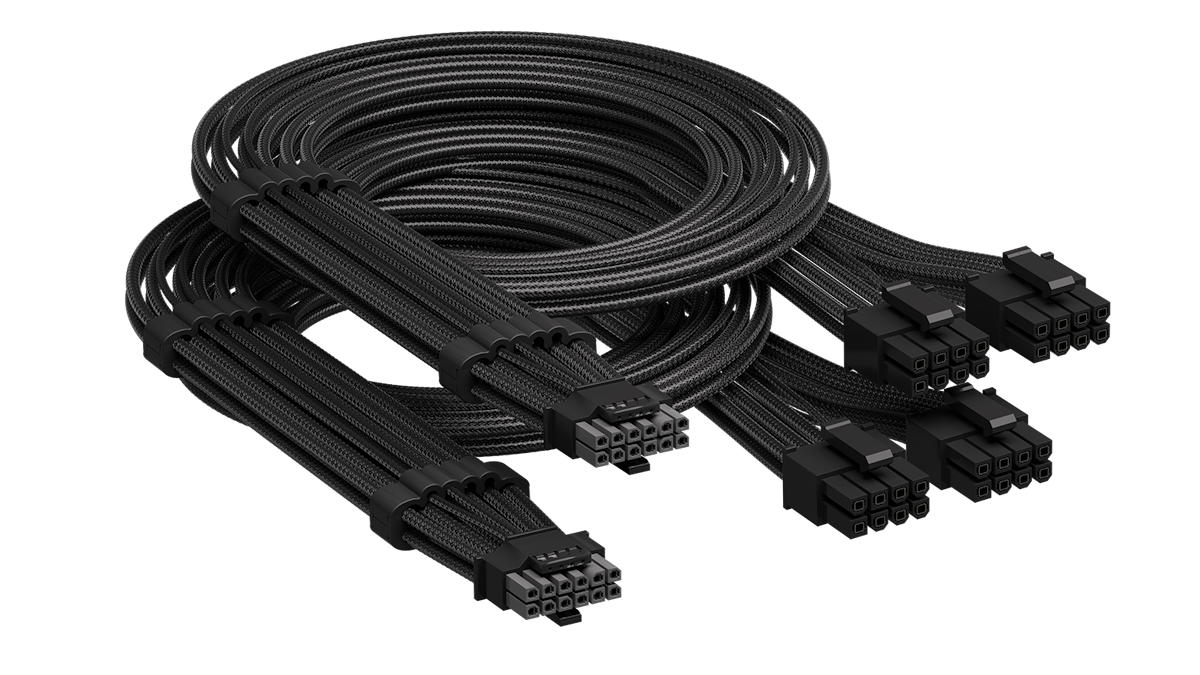 这两款电源标配升级后的压纹模组线,配有纵向凸起幅度较小的低矮理线梳。与一般高端 ATX 3.1 电源不同的是,2025 款 HX1200i / HX1500i 依旧不配备原生 12V-2×6 模组接口,而是提供了 2 组双 8Pin 转 12V-2×6 线材,该转接线的 12V-2×6 端子一侧采用双色设计,便于用户判断是否插紧。