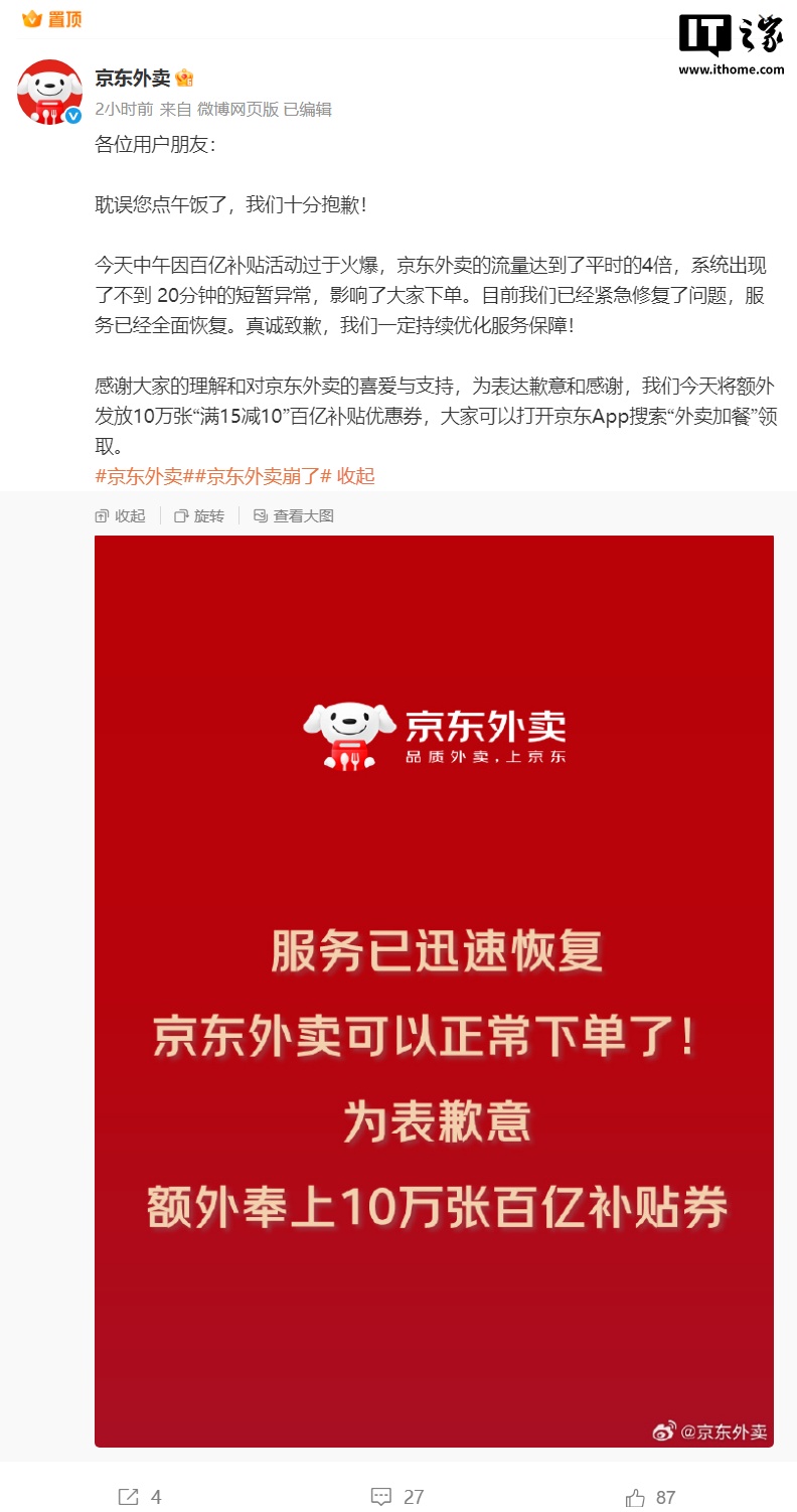对此,京东外卖官方微博发布公告,今天中午因百亿补贴活动过于火爆,京东外卖的流量达到了平时的 4 倍,系统出现了不到 20 分钟的短暂异常。目前官方已经紧急修复了问题,服务已经全面恢复。